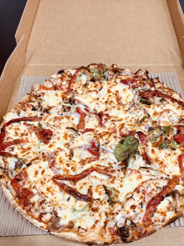 Sauce, cheese, chicken, mushrooms, roasted peppers, red onion, spinach and bocconcini cheese.