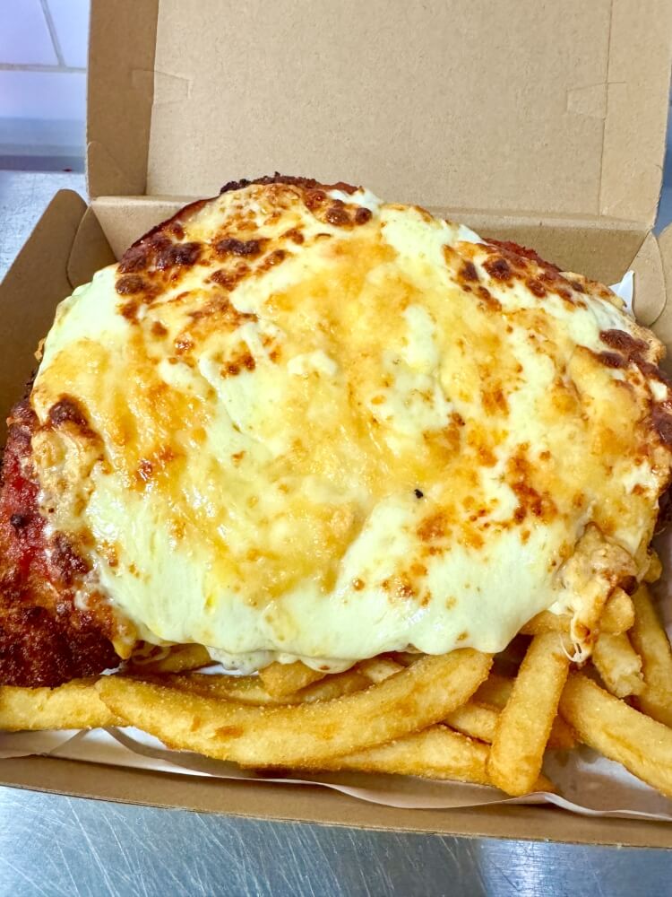Crumbed breast chicken layered with shaved ham, Napoli sauce, topped with mozzarella and shaved parmesan.