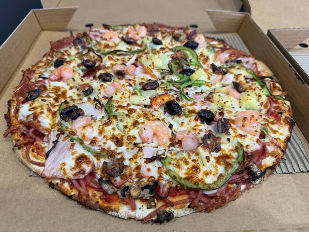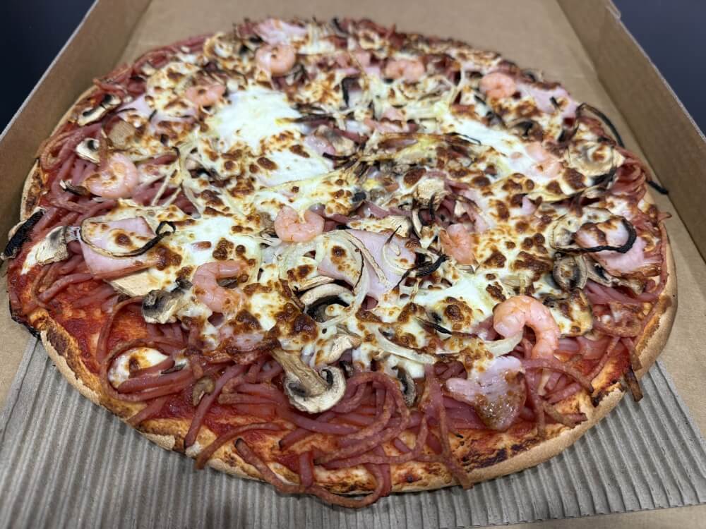 Sauce, cheese, ham, bacon, mushrooms, onion, prawns and egg.
