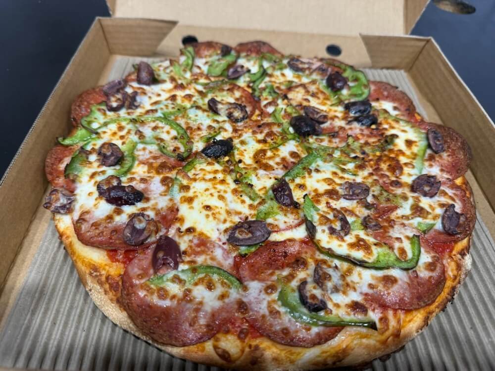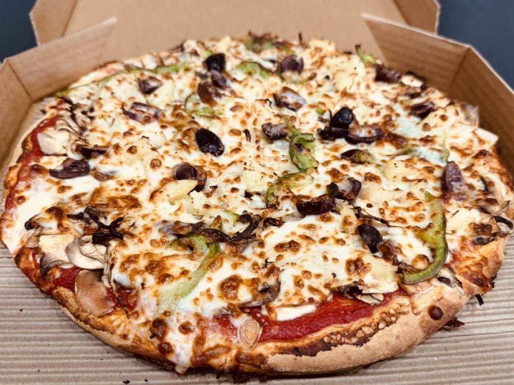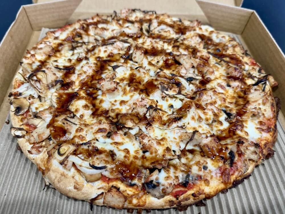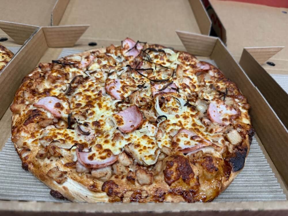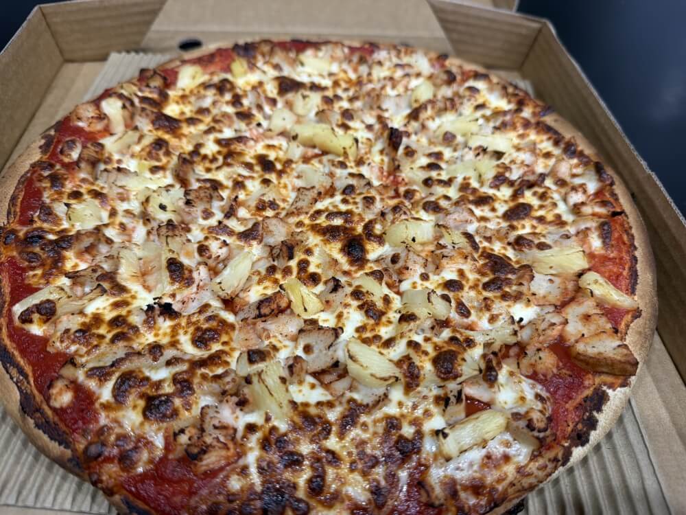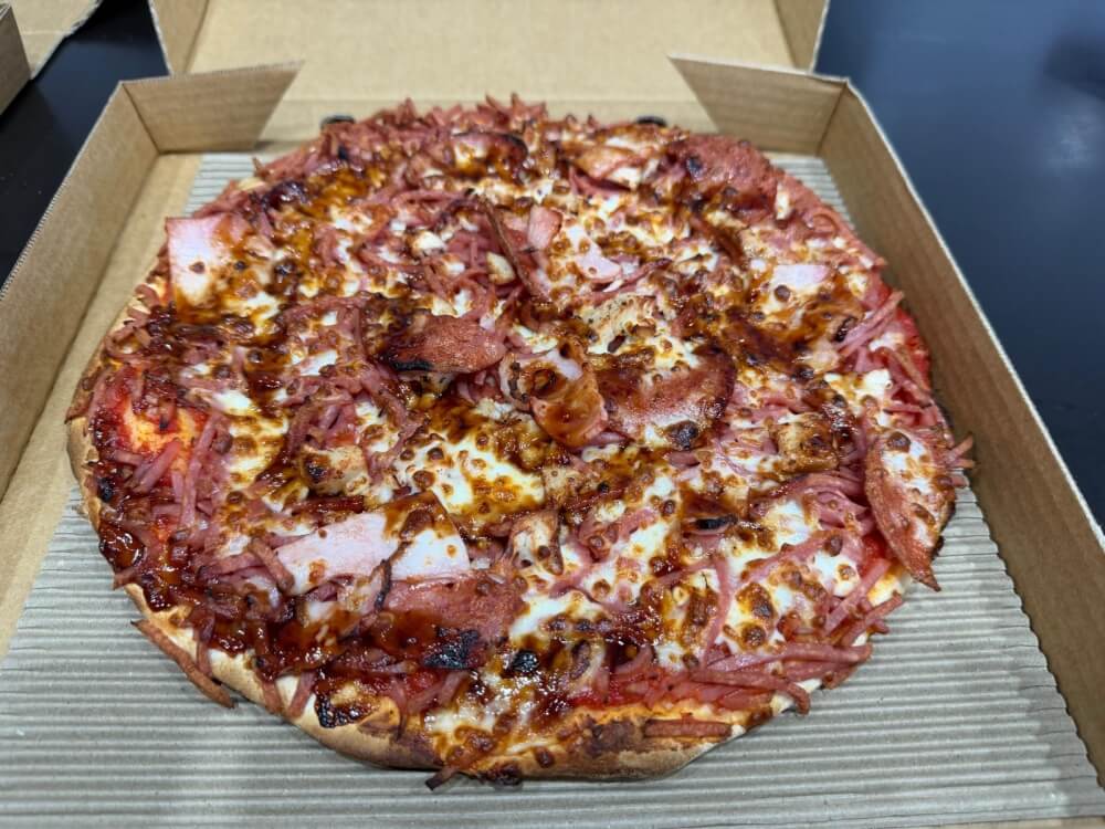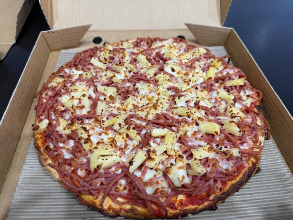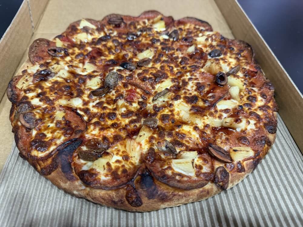 Tomato Base, Salami(Hot), Olives, Pineapple, Cheese and BBQ Swirl.