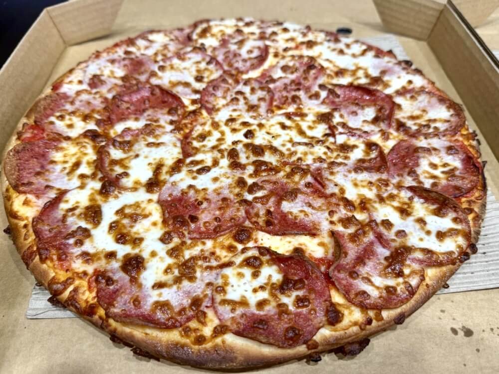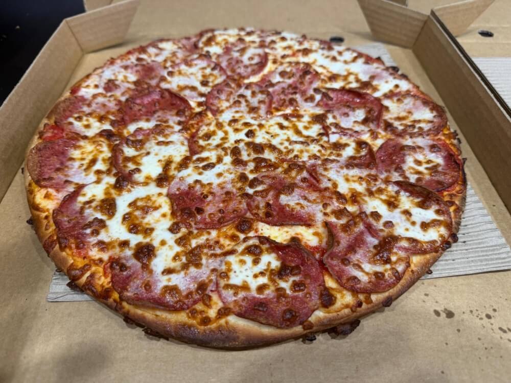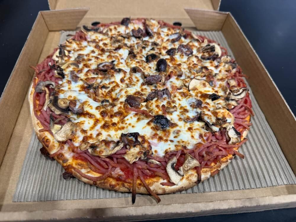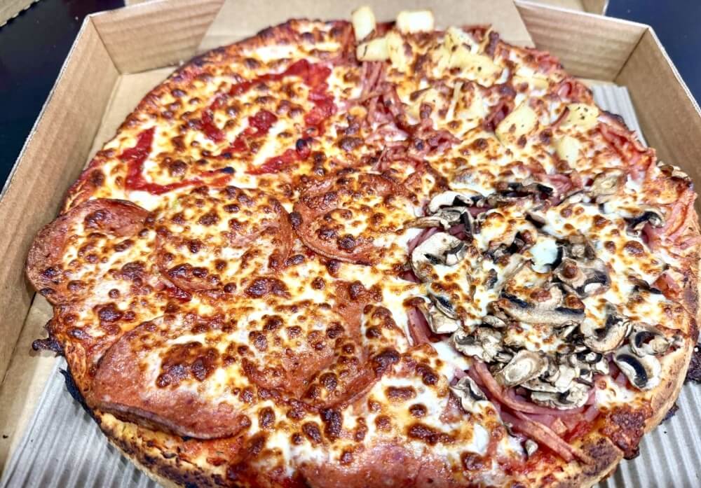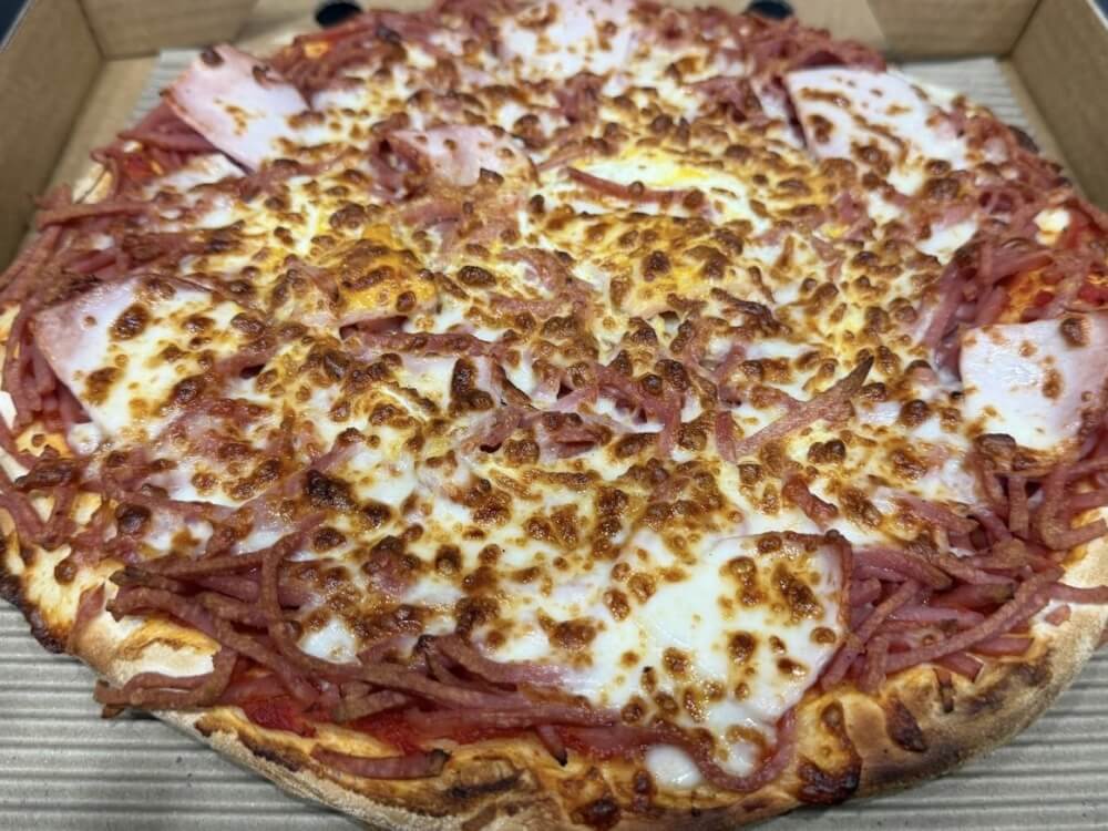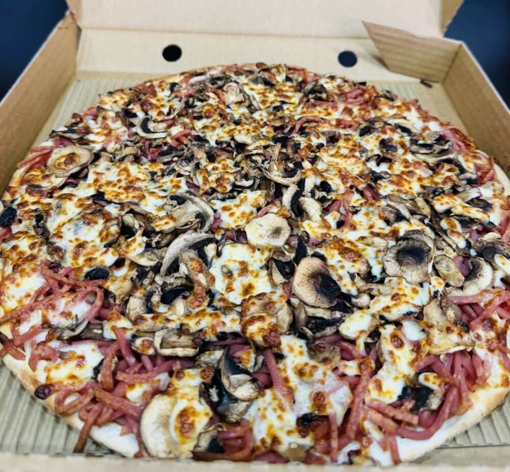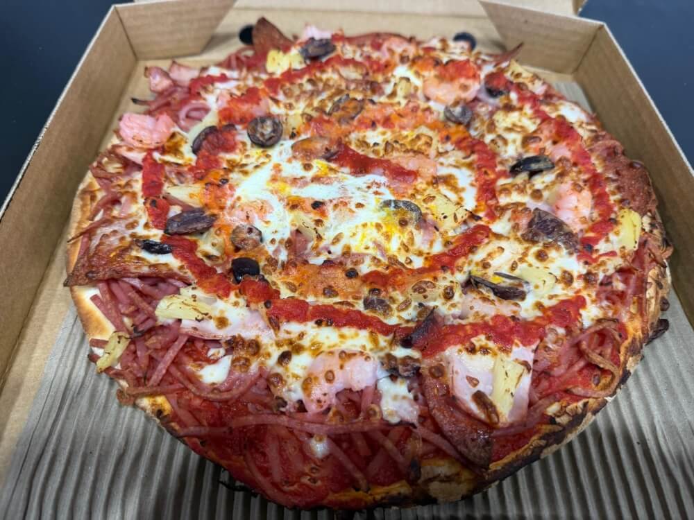 Tomato Base, Ham, Salami(Hot), Mushrooms, Pineapple, Cheese, Oregano and Tomato Swirl.