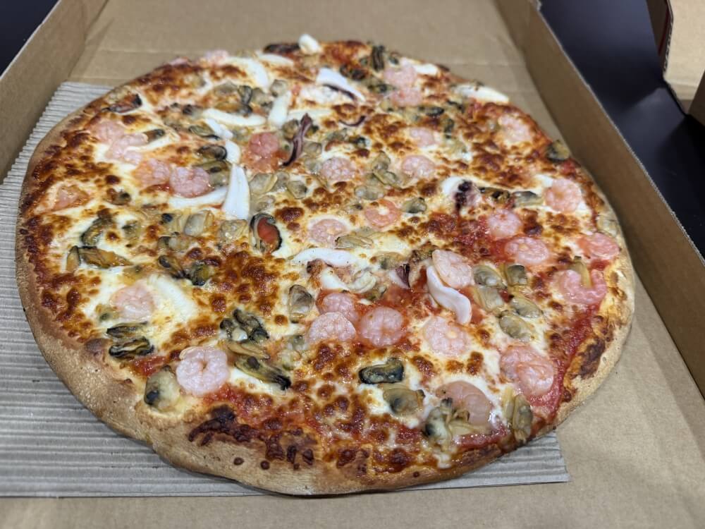 Sauce, cheese, seafood mix, anchovy, garlic and oregano.