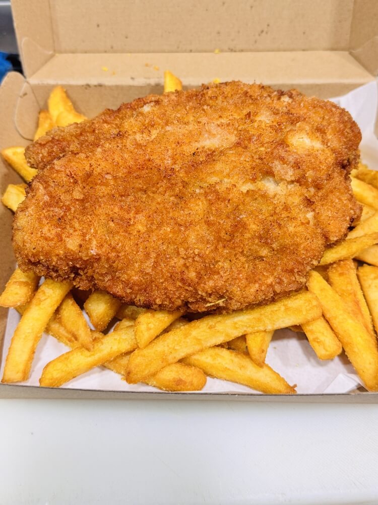 Crumbed breast chicken served on a bed of chips with a side of salad.
