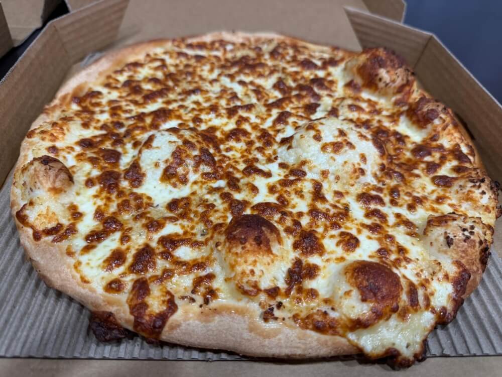 Five cheeses. Sauce, mozzarella, halloumi, feta, bocconcini and parmesan.