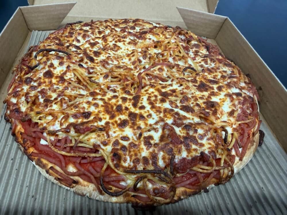 Sauce, cheese, ham, spaghetti and bolognese sauce on top.