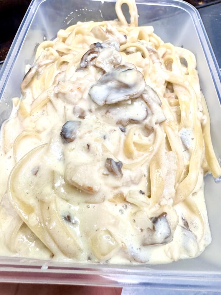 Chicken and bacon cooked in onion and garlic until tender with added mushrooms and cream.